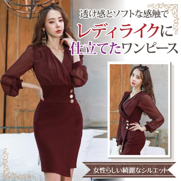 ナイトドレス キャバドレス ミディアムドレス カシュクール ハイウエスト ワンピース 長袖 Vネック レディース グラシア