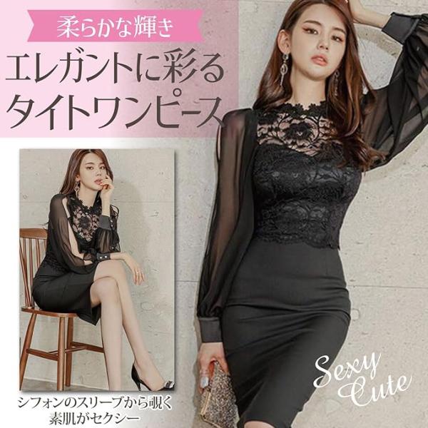 ナイトドレス キャバドレス ミディアムドレス タイト ワンピース 長袖 サテン シフォン スリット レース レディース グラシア