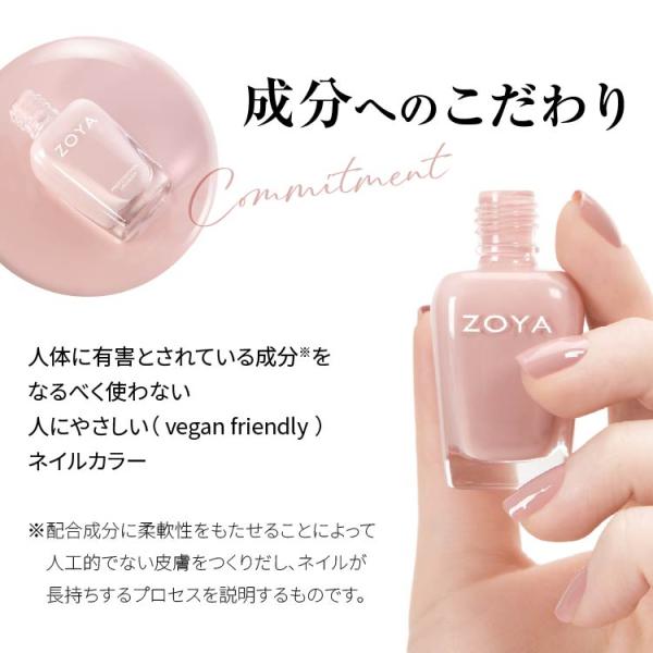 人体に有害とされる化学物質を使用しない商品開発にいち早く取り組んだネイルブランド「ZOYA(ゾーヤ)」のネイルカラー。ZOYAは米国DTSC※において、トルエン・ホルマリン・DBT(フタル酸ジブチル)の有害物質が検出されなかったことからも、商品の安全性が証明されています。柔軟性に優れ、はがれにくく長持ちするのでお手入れが簡単です。