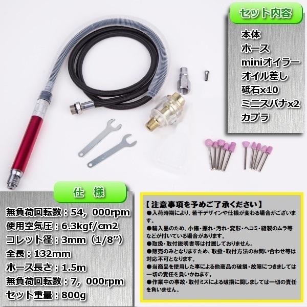 セット内容:本体、ホース、miniオイラー、オイル差し、砥石x10、ミニスパナx2、カプラ
