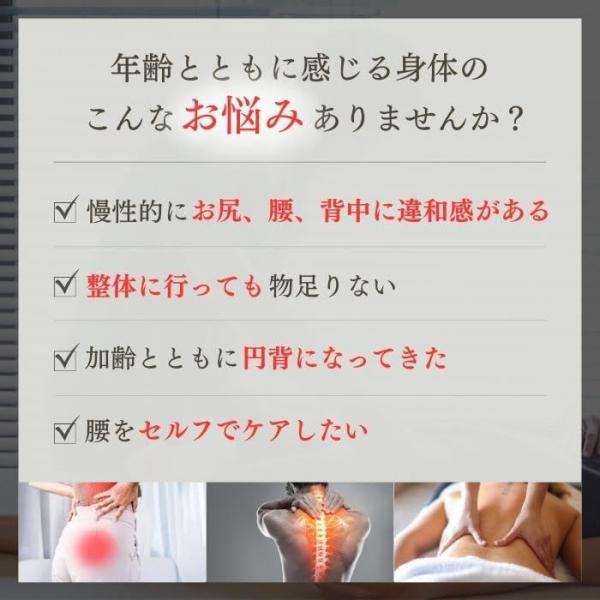 腰や背中を自分で指圧すると、あまり力をかけられなかったり、届かない…なんてことや、無理な体勢や姿勢になってしまい、そのせいで逆にかえって肩や腕がこってしまい、疲れてしまった…なんてことが誰にでもあるのではないでしょうか。 病院やマッサージ屋さんに行って手当てをするにも、慢性的なこりを取るには時間をかけてじっくり取っていく他ありませんので、お金も時間も浪費してしまいます。 骨盤職人を使うことで、そんな腰や背中、臀部のツボを、寝ながら簡単にマッサージ することができます。また、臀部や腰、背中をマッサージしていくことにより、骨盤矯正や、姿勢の改善にも繋がります。骨盤職人を使用して、心も身体もリフレッシュしましょう!