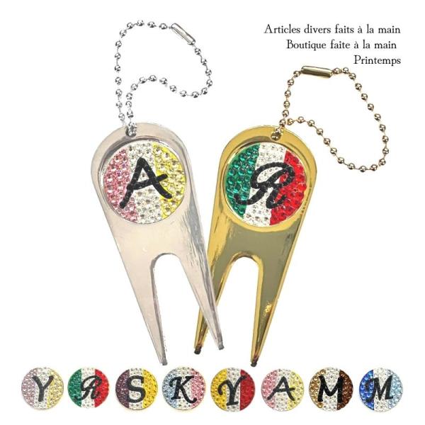 イニシャル入れ SWAROVSKI ゴルフマーカー フォーク トリコロールカラー ゴルフ マーカー キーホルダー ホールインワン ゴルフ用品 プレゼント