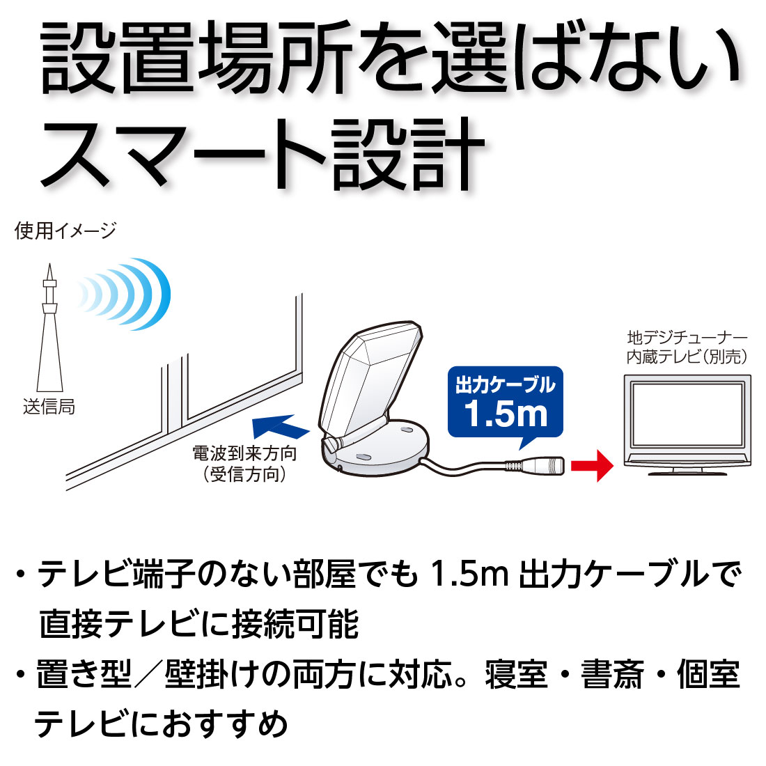 ブースターを搭載しないシンプルな構造で、強電界地域での地デジ受信に最適。