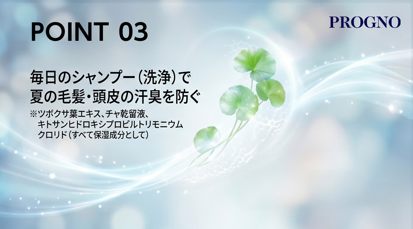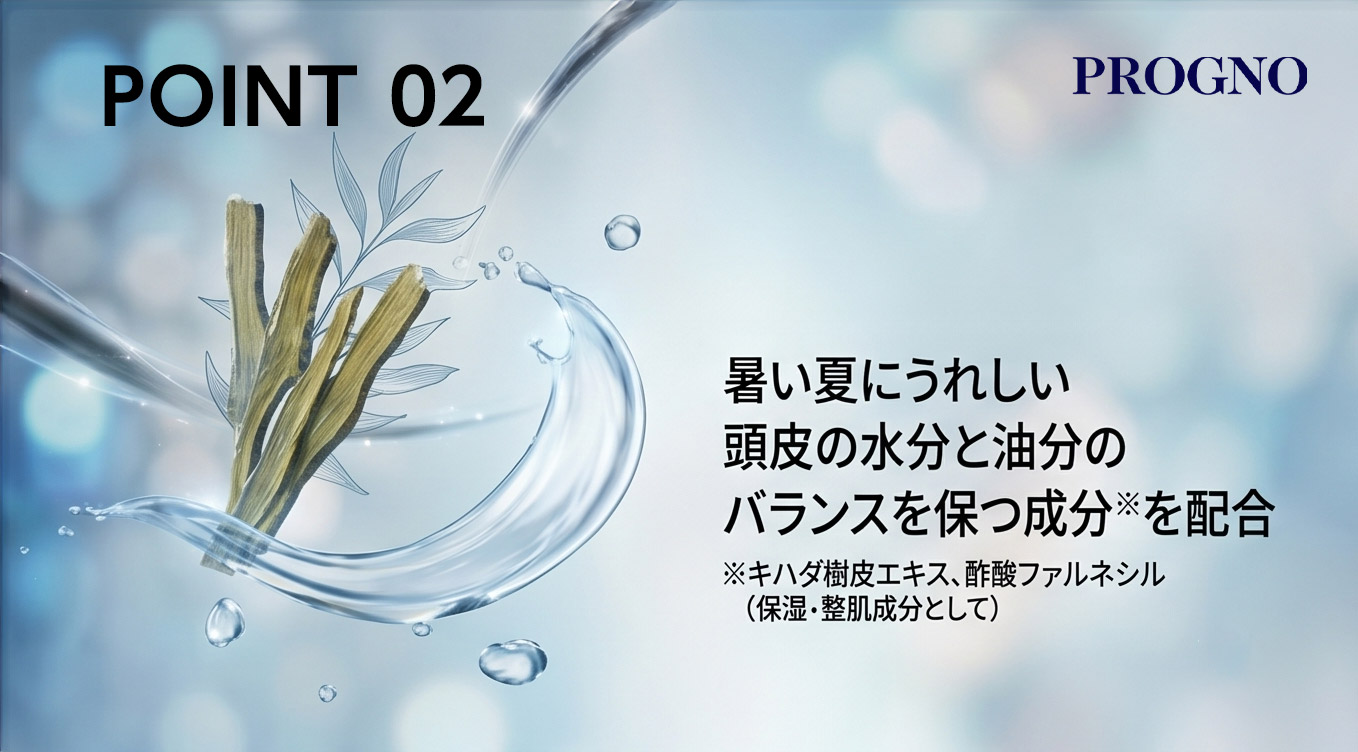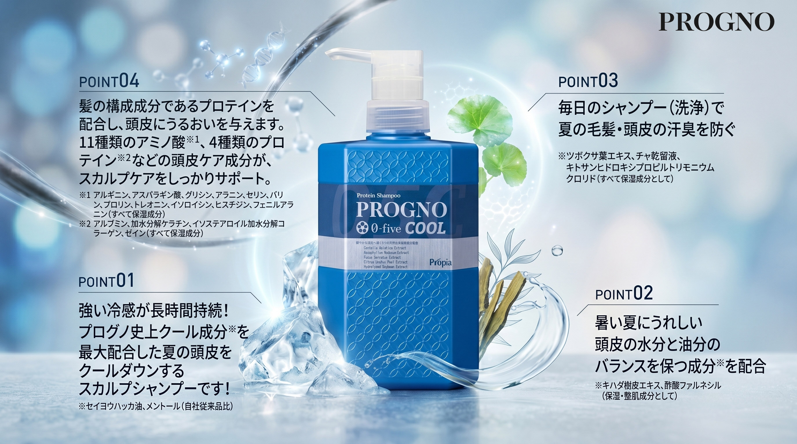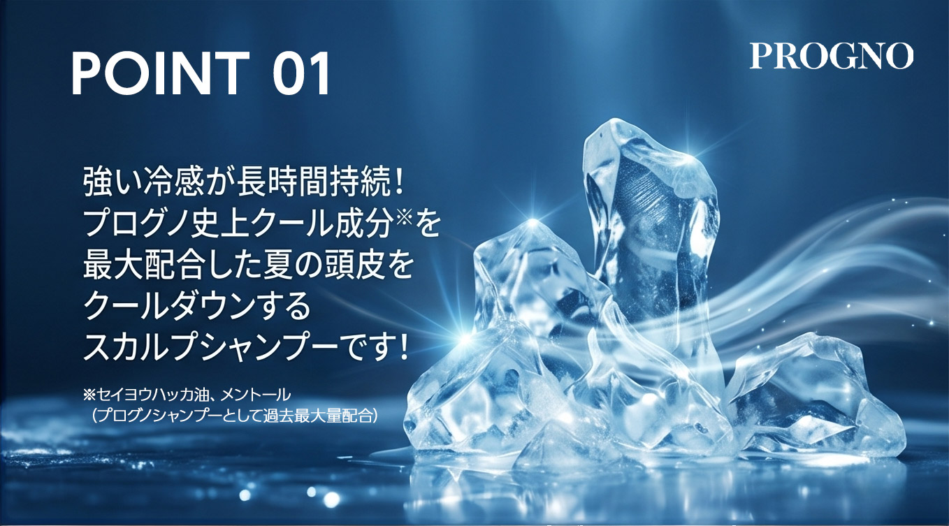 強い冷感が持続する!プログノ史上クール成分※を最大配合した夏の頭皮をクールダウンするスカルプシャンプーです!