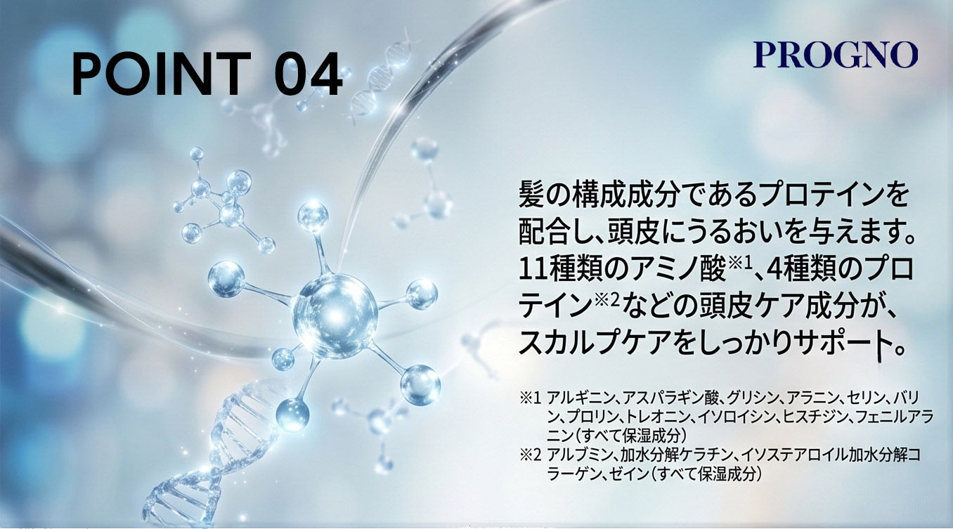 髪の構成成分であるプロテインを配合し頭皮にうるおいを与える。11種類のアミノ酸※1、4種類のプロテイン※2、などがスカルプケアをサポート。
