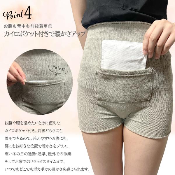 お腹や腰を温めたいときに便利なカイロポケット付き。前後どちらにも着用できるので、冷えやすいお腹にも、腰にもお好きな位置で暖かさをプラス。