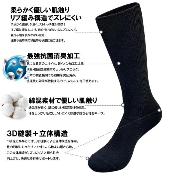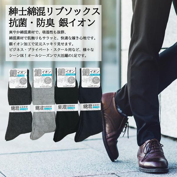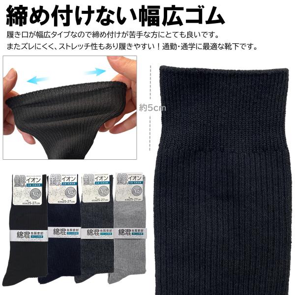 送料無料 即納 25-27cm 抗菌防臭 銀イオン クルーソックス メンズ 靴下 リブ 無地 ビジネス 幅広ゴム 黒 紺 グレー 足のムレ 通勤 通学 綿混 男性 紳士