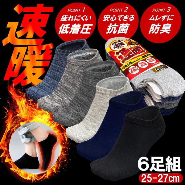 6足組 メンズ 靴下 速暖 壁暖 パイルカバー ショートソックス 無地 秋冬 かかと滑り止め付き 立体縫製 ズレ防止 足にフィット あったか 暖かい くるぶし 25-27cm