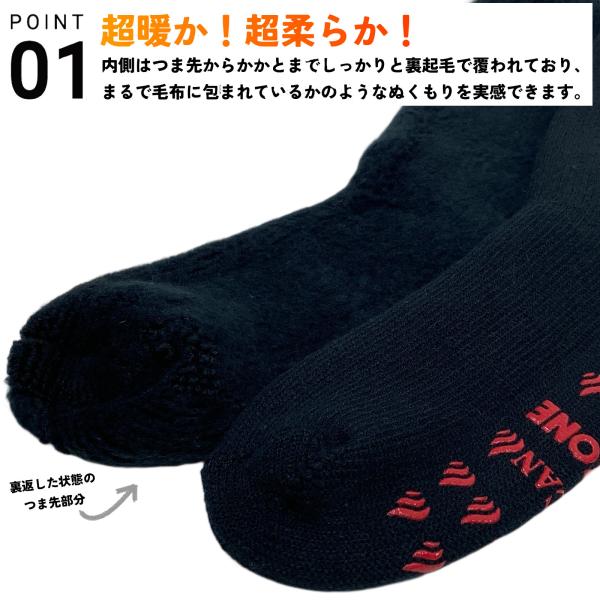 アクリル混素材を使用した、ふわふわの裏起毛が足全体を包み込みます。