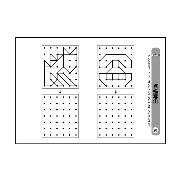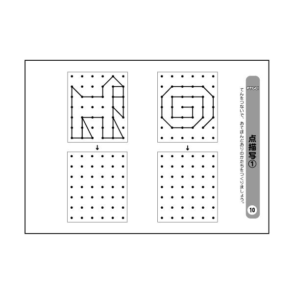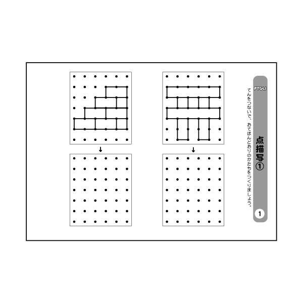 お手本通りに図形を点に沿って書き写します。「点描写」の問題は、小学校の入試問題でもよく用いられるものの一つです。点描写によって「注意力」「構成把握能力」「作業能力」「筆圧」「指先の調整能力」などの知能因子のチェックを一度に行うことができるので、よく出題されるのだと思われます。特に、図形関連の能力とは、深い関係があるかのように見受けられます。出題形式としては、お手本の図形をそのまま写す問題が基本です。まずは点描写の基本的な問題を取り上げた「点描写1」から始めてください。