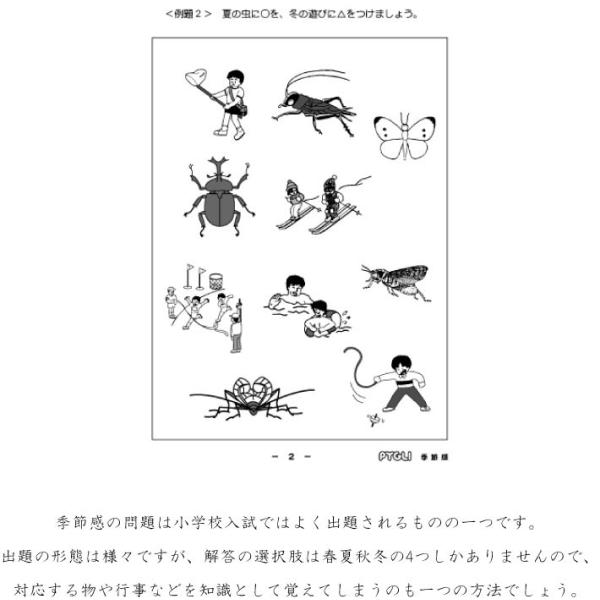 季節感の問題は、小学校入試ではよく出題されるものの一つです。出題の形態は様々ですが、解答の選択肢は春夏秋冬の4つしかありませんので、対応する物や行事などを知識として覚えてしまうのも一つの方法でしょう。