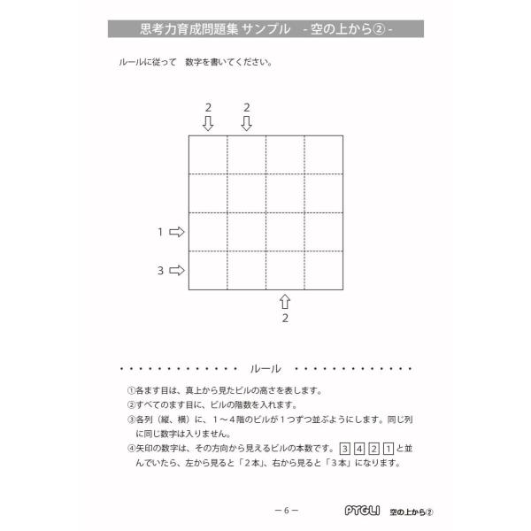 並び方により低いビルは高いビルに隠れてしまうことを利用したパズルです。ある列に注目してビルを立体的にイメージすることと、全体を見て各階のビルの位置に注目することが大切です。このパズルで空間位置把握能力を高めましょう。