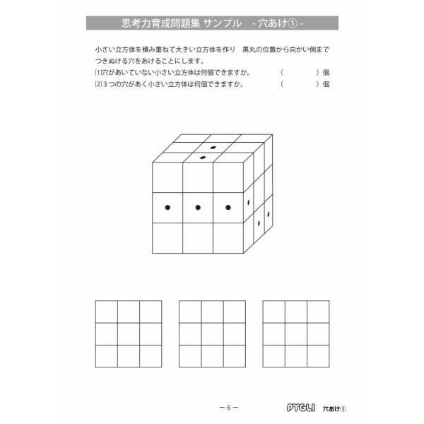 思考力育成問題集セットDは、立体図形をテーマにした思考力パズルで、「積み木推理」「立体認知」などの応用問題になります。いずれも、平面でなく立体的な空間をイメージすることで、高い空間把握能力が身に付きます。
