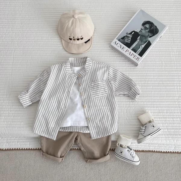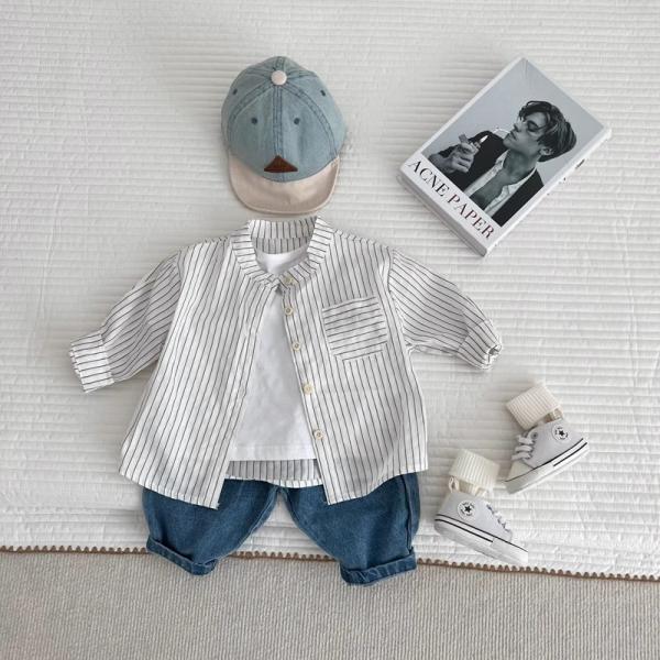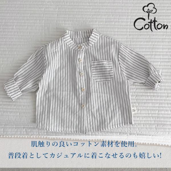 シャツ ブラウス カジュアルシャツ ベビー キッズ 子供 男の子 白 長袖 立襟 ストライプ柄 73 80 90 出産祝い 七五三 写真撮影 保育園 幼稚園 通園 ブランド
