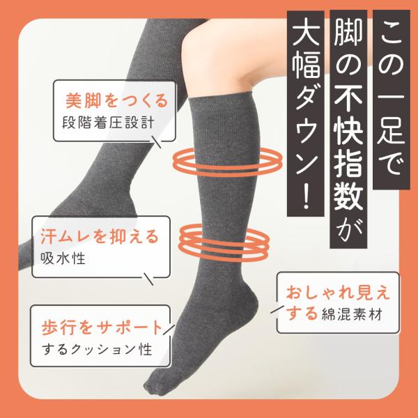 おしゃれ見えする綿混素材で、一見すると普通の靴下のようなデザイン。おしゃれを楽しみながらしっかり美脚ケアが可能。