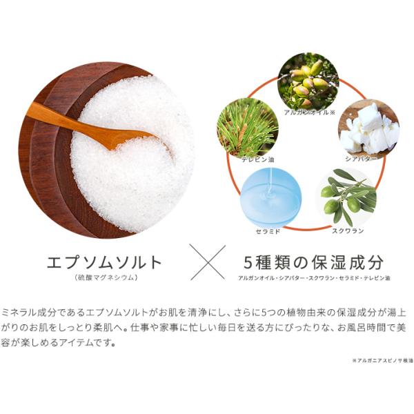 欧米の美容家やセレブリティに愛されている話題のエプソムソルトに、植物由来の5つの保湿成分を配合。