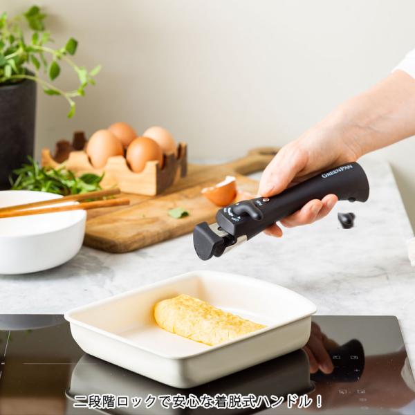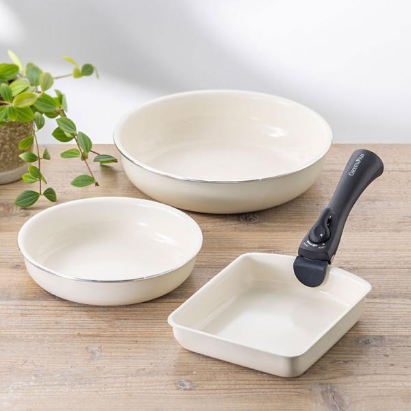 ハンドルが取り外し可能なクリックシェフシリーズ。フライパンや鍋をコンパクトに収納できるのも魅力です。ハンドルを外せばオーブンでも使用可能です。セット5はフライパンとエッグパンのセットです。