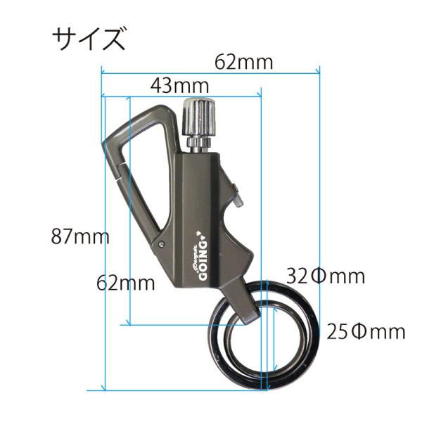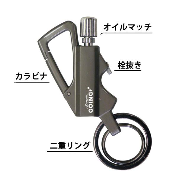 カラビナ付きで持ち運びに便利なオイルマッチ。栓抜きと2重リングも付いています。※オイルの入れ方・着火方法等は下記の「商品説明」から動画をご確認下さい。