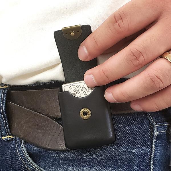ZIPPO・ジッポー用。ベルト通しは固定式で約35mm幅まで装着でき、キャンプやアウトドアでも便利。