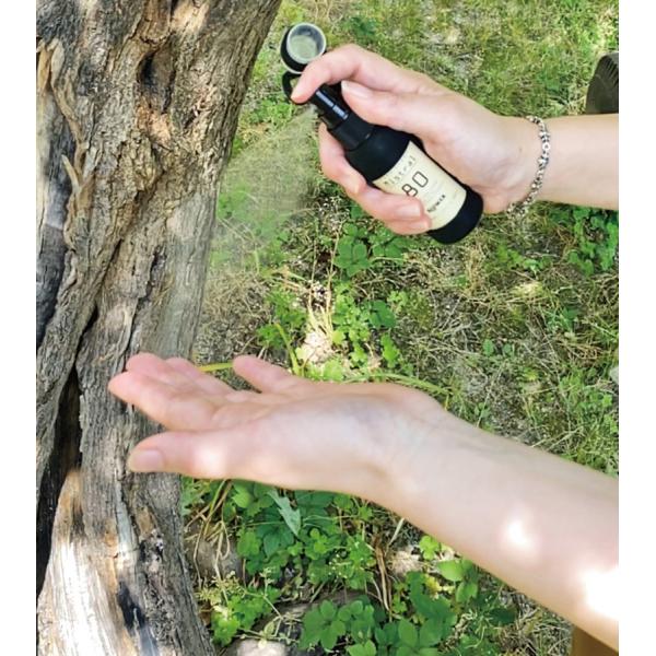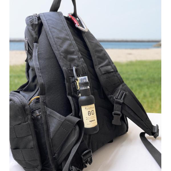 PUMP SPRAY BOTTLEタイプでアルコール濃度80%以下対応、持ち運びに便利なストラップとカラビナ付き。
