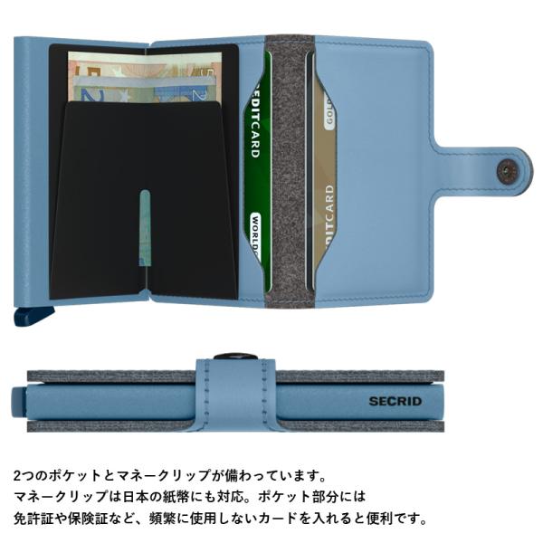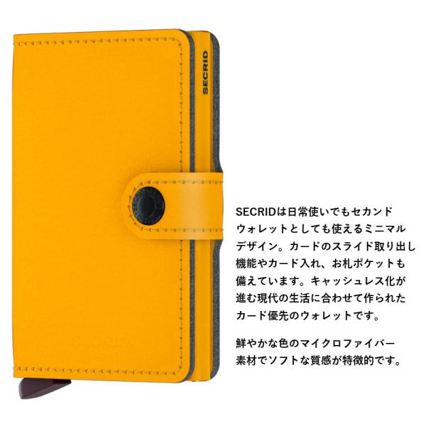 SECRIDは日常使いでもセカンドウォレットとしても使えるミニマルデザイン。カードのスライド取り出し機能やカード入れ、お札ポケットも備えています。キャッシュレス化が進む現代の生活に合わせて作られた「カード優先」のウォレットです。鮮やかな色のマイクロファイバー素材でソフトな質感が特徴的です。
