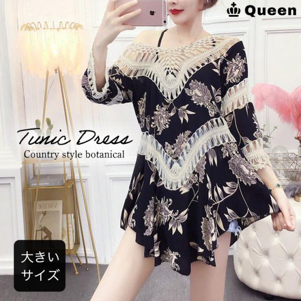 チュニックシャツ ミニワンピ スモックブラウス ボタニカル柄 五分袖 大きいサイズ レディース 夏 LL 3L 4L 5L 6L ブラック ベージュ