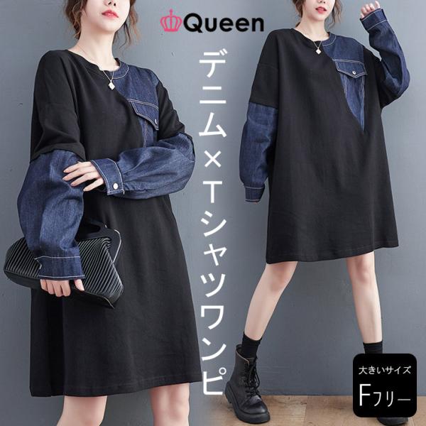 大きいサイズ レディース デニム切替チュニック オーバーサイズ 長袖 ミニワンピ 黒 ロンT 春 秋 LL 3L 4L 5L 6L ブラック 新入荷 メール便可