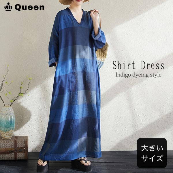 シャツワンピ 長袖 チェック柄 ワンピース マキシワンピ Vネック 薄手 藍染風 大きいサイズ レディース 春夏 LL 3L 4L 5L 6L ブルー