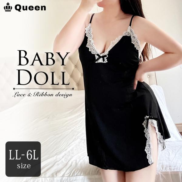 ベビードール レース リボン ブラック スリット Tバック付き 大きいサイズ レディース LL 3L 4L 5L 6L Queen クイーン