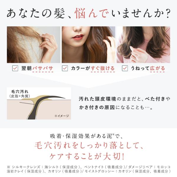 泥の地肌ヘッドスパ※でサラサラとしたかろやかな髪(シルキークレンズ)/なめらかでまとまりのある髪(ダメージリペア)/みずみずしくツヤのある髪(モイストグロッシー)。