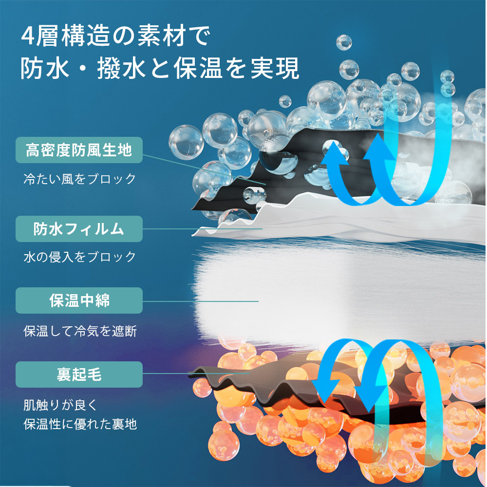 ・防風素材、中綿、防水フィルム、裏起毛生地の4層構造です。