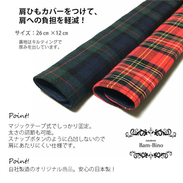 肩ひもカバー 肩紐カバー ショルダーカバー 26cm 水筒 タータンチェック グリーン レッド 細身 標準 バッグ キッズ 幼稚園 保育園 小学校 マジックテープ