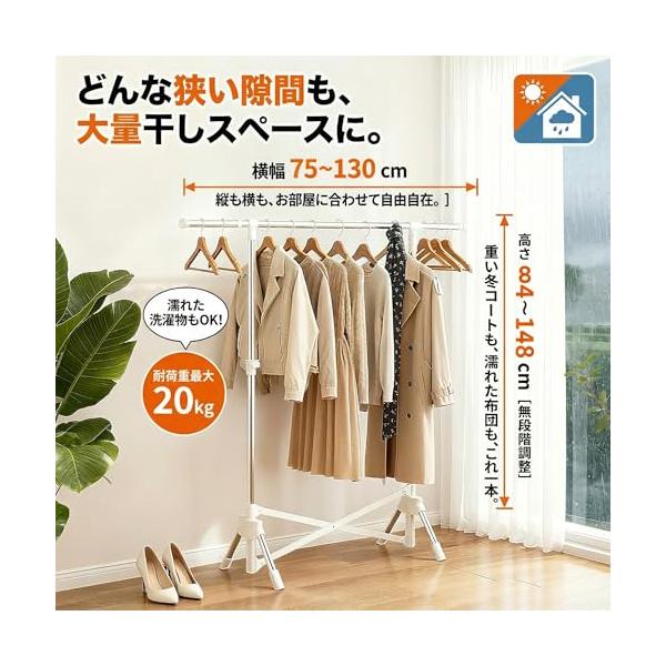 ・伸縮自由・大容量伸縮自在の大容量物干し。高さは84〜148cm、横バーは75〜130cmまで調整。耐荷重20kgで厚手の布団や大量の衣類にも対応。雨天の室内干しは家族分を一気に干せ、必要に応じてバーを伸ばして干し幅を確保。重なりが減り、乾きが早まります。