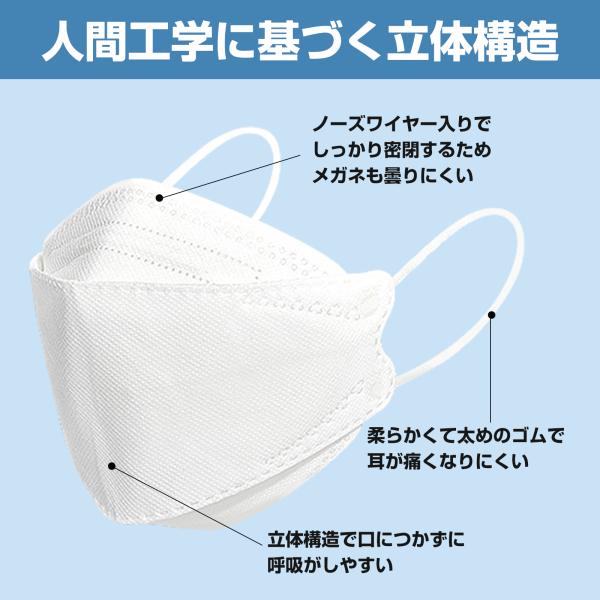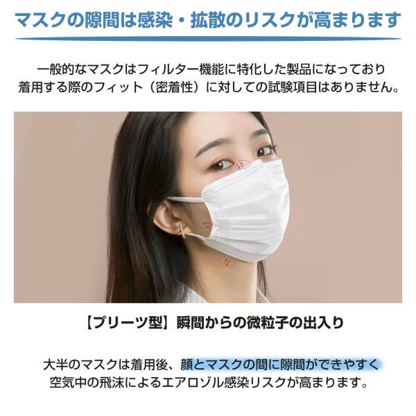 ●一般的な不織布マスクはフィルター性能に特化したものが多く顔との密着性については追求されていないものがほとんどです。特に側面に関しては大きく隙間ができることも。立体3D構造で隙間カバー・快適性UP!