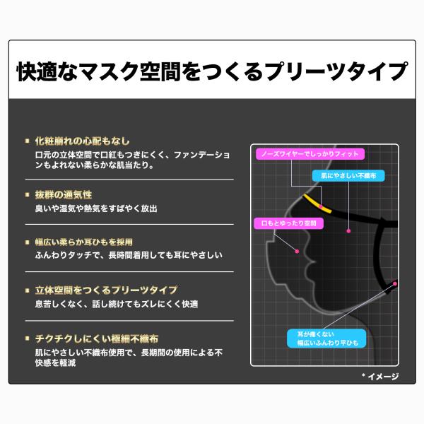 ●マスクとして違和感のないシンプルなデザイン。側面まで密着する構造は従来品のように幅が広がらず小顔効果も。しっかりと立体感があり、マスク内の口や鼻の部分に空間が生まれます。呼吸しやすく口紅等も付着しづらい構造。