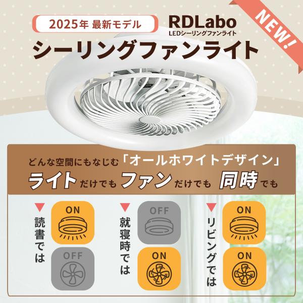 【360度回転式 LEDシーリングファンライト】 RDLabo 逆回転 静音 節電設計 省エネ 照明OFFでも送風可 6〜12畳対応 調光調色 自動首振り 部屋干し オールホワイト