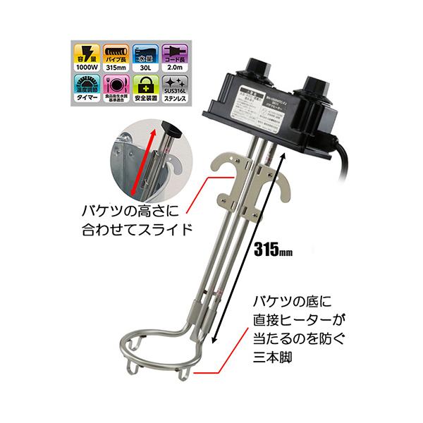 安全・安心、過昇防止センサー、温度調整、タイマー付きの充実装備バケツヒーターです。