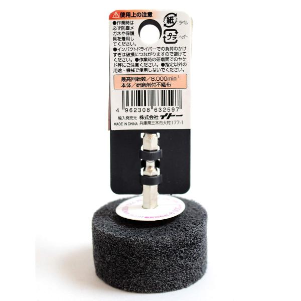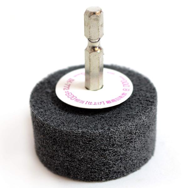 木材・金属・樹脂などの研磨・仕上げに最適な、研磨材入り不織布繊維を圧縮し適度な弾力と柔軟性を持たせ目詰まりがしにくい、直径50mmの六角軸磨きホイルです。