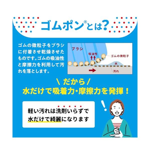 今までのゴムは吸油性と摩擦力があり、ゴムポンは、油汚れなどを吸着・摩擦力により、 洗剤なし