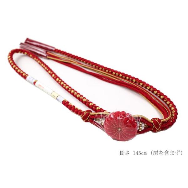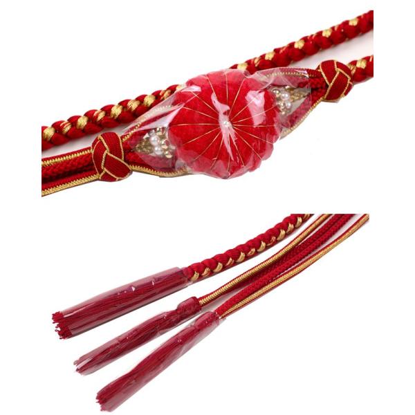 帯締めは、ちりめん万寿菊にパールビーズとゴールドの飾りを挟んで、片側は4本バラケになっています。結び方は色々ですが、アレンジを楽しめますし、何より豪華さが違います。振袖姿をより美しく、華やかに引き立たせてます。