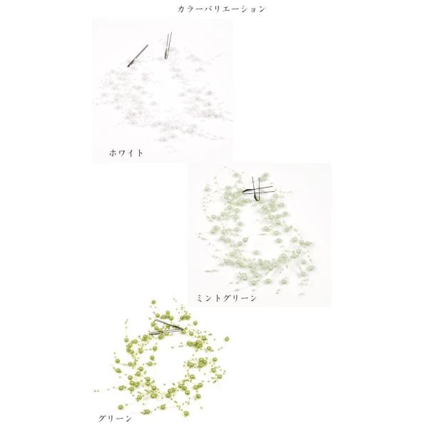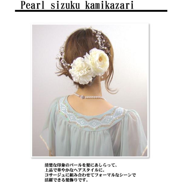 パールの髪飾りを髪に飾るだけでパッと華やかに仕上がります。コサージュだけでは何か物足りないときにもってこいのアイテムです。ひとつ付けでも華やかですが、ふたつ付けでより一層華やかさが増します。片方にアクセントとして飾っても、カチューシャのように飾っても可愛らしく仕上がります。パールの長さが気になるようでしたら、Uピンで押さえてお好みの長さに。