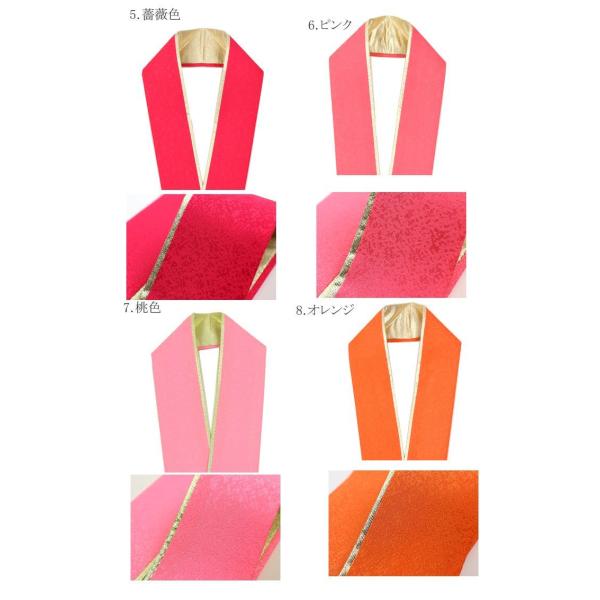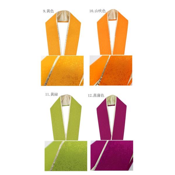 色の出し方は、色一色、金一色、色/金、金/色、の四通りでご利用頂けます。正絹ならではの美しい発色で、衿元がパッと明るくなる重ね衿。色を変えるとお着物の雰囲気も少し変わりますので、いろいろ変えてお楽しみ下さい。