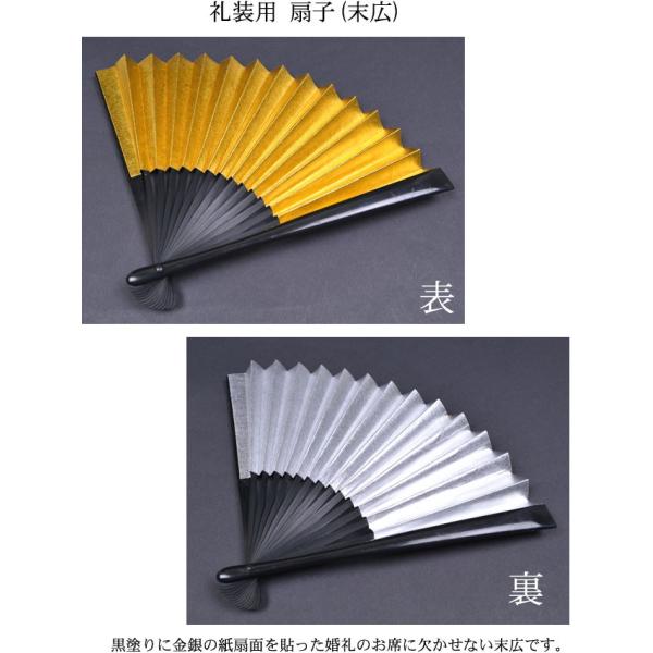 留袖用の扇子です。結婚式や結納などお祝いの席でお使いいただけます。末広とも呼ばれていますが、家庭が末広がりに栄えるようにという願いを込めて名づけられています。表は金・裏面は銀になっており、結婚式で扇子(末広)は午前の式では表の金を、午後の式では裏の銀を前向きに使うという習慣もあります。