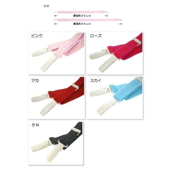 カラーはピンク、ローズ、アカ、スカイ、黒の5色。サイズはMのみとなります。コーリンベルトは、片方の留め具を下前の衿先に固定して、もう片方を身八ツ口から後ろへ回し、上前の衿先に止めます。たとえばMサイズ(最大ゴム長56cm)の場合、それが胴を一周するのではなく、後ろへ半周強するとお考え下さい。