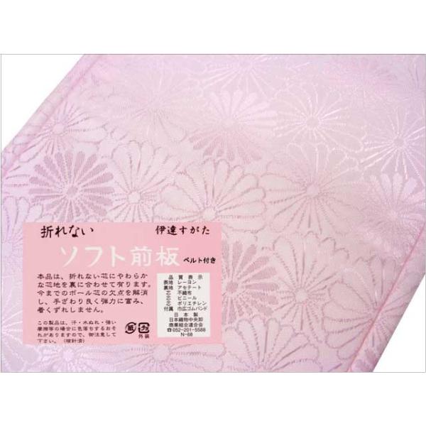 ポリエチレン芯にやわらかな芯地を合わせて使用した、ソフトで折れない前板のロングタイプです。お振袖や変わり結びには、ロングタイプをお選び下さい。ふくよかな方もこちらになります。手触りも良く弾力に富み、着崩れしません。ビギナーにも簡単にお使い頂けるベルト付きです。