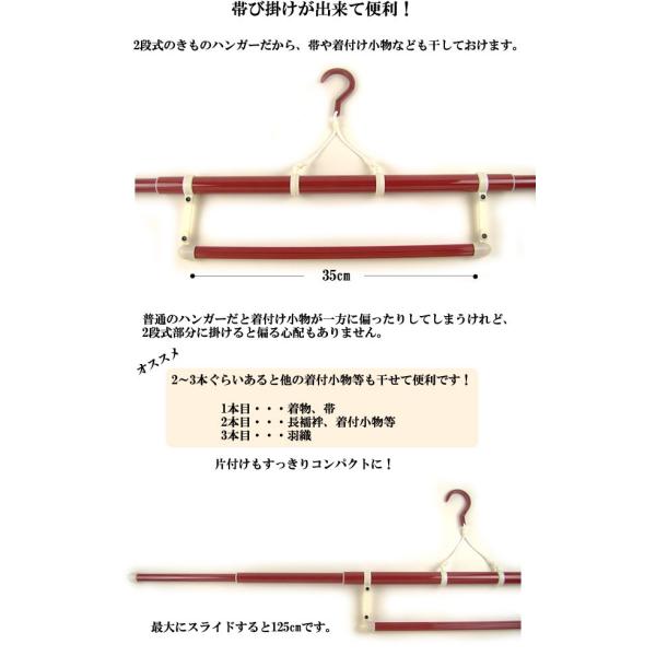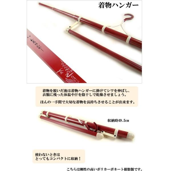 きものを脱いだあとの手入れに必要なきものハンガーです。着ているうちに気がつかないけれど、汗をかいたりほこりをかぶったりしています。それをそのまましまってしまうと、きものの寿命を縮めることにも。必ずハンガーにかけて陰干しを忘れずに。素材は頑丈なポリカーボネット製耐衝撃性に優れ丈夫です。帯び掛けの付いた3段伸縮タイプなので伸縮自在で収納はコンパクト!