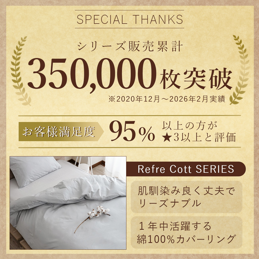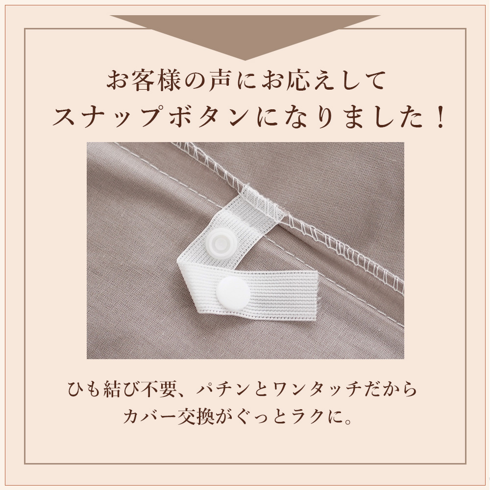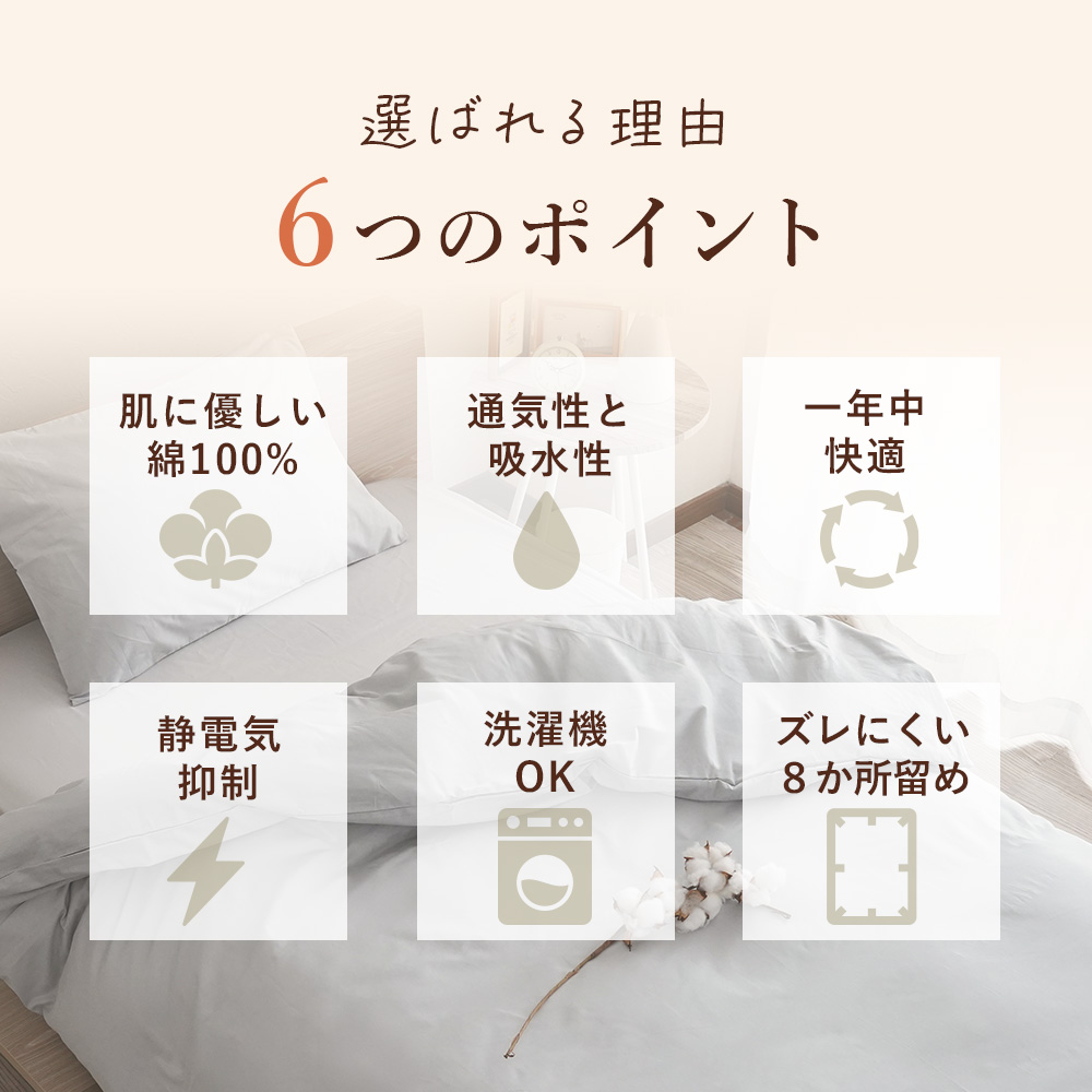 ・ファスナーは端まで開き出し入れ楽々。布団の角をしっかり固定できる8か所留め付きでカバーがずれにくく、吸水、保湿の優れたなめらかな綿は、通年お使いいただけます。