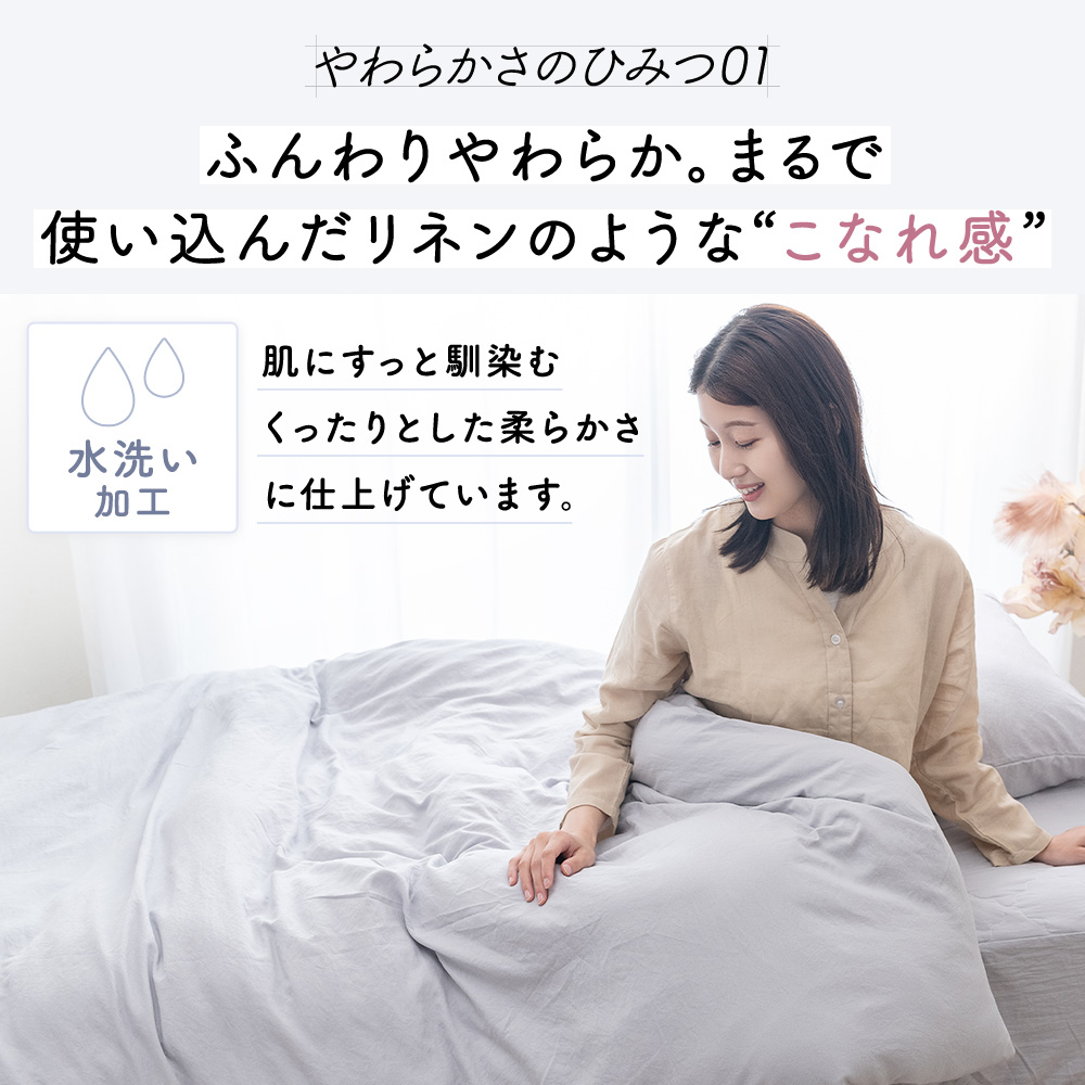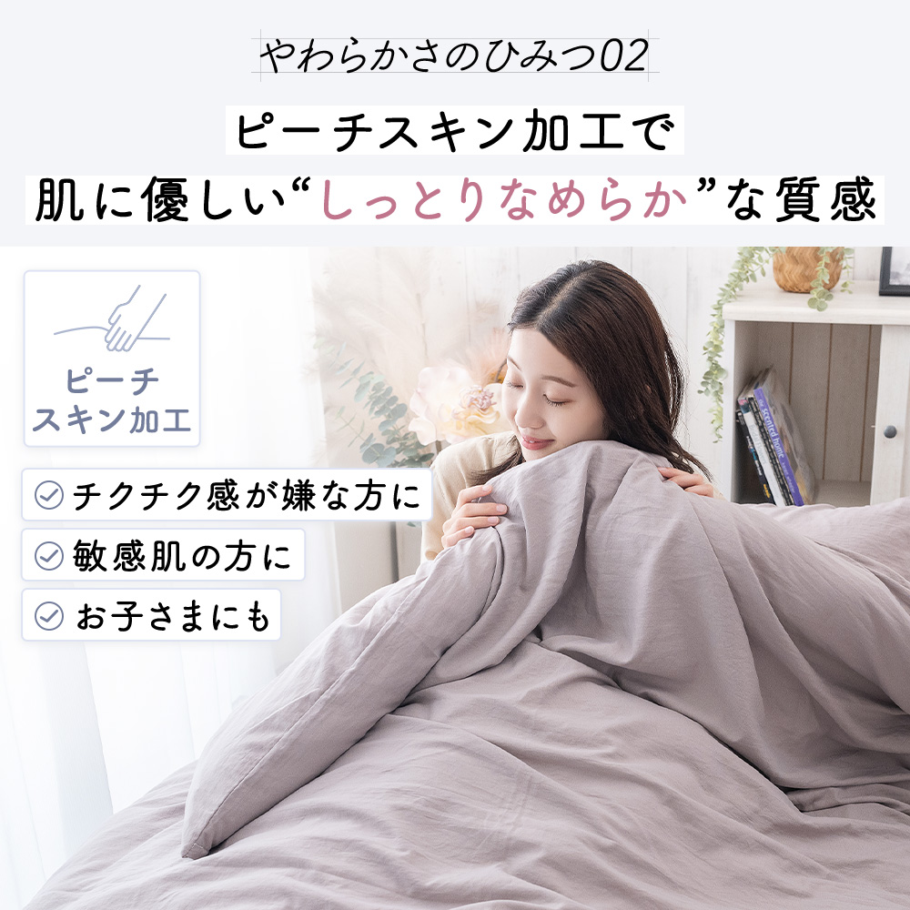 ピーチスキン加工の生地表面の産毛は空気を含むので、布団に入った時に感じるひんやり感を軽減します。一年を通して快適にお使いいただけます。