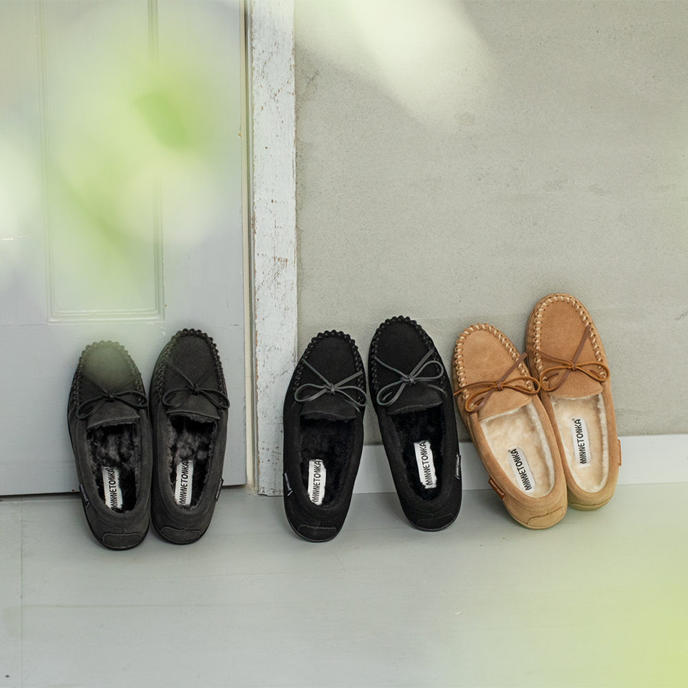 ミネトンカらしいスエードレザーのモカシンにファーのライニングを付けたふわもこな履き心地の良いアイテム。