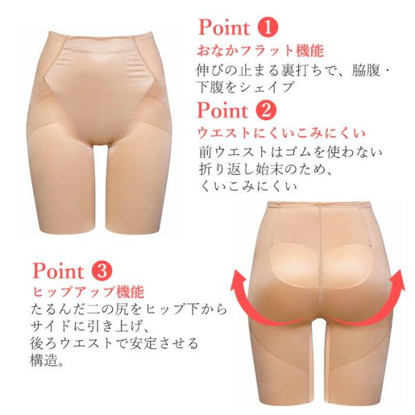たるんだ二の尻をヒップ下からサイドにかけて引き上げ、後ろウエストで安定させる構造でヒップアップ